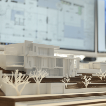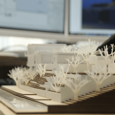 Das Präsenationsmodell des Bootshauses in Mannheim wurde mittels Lasercut aus Finnpappe und 3D gedruckter Bebauuung hergestellt.