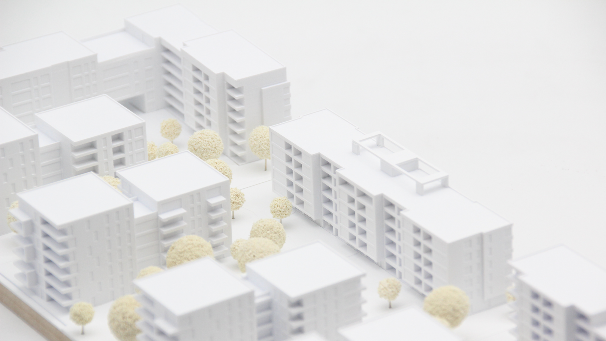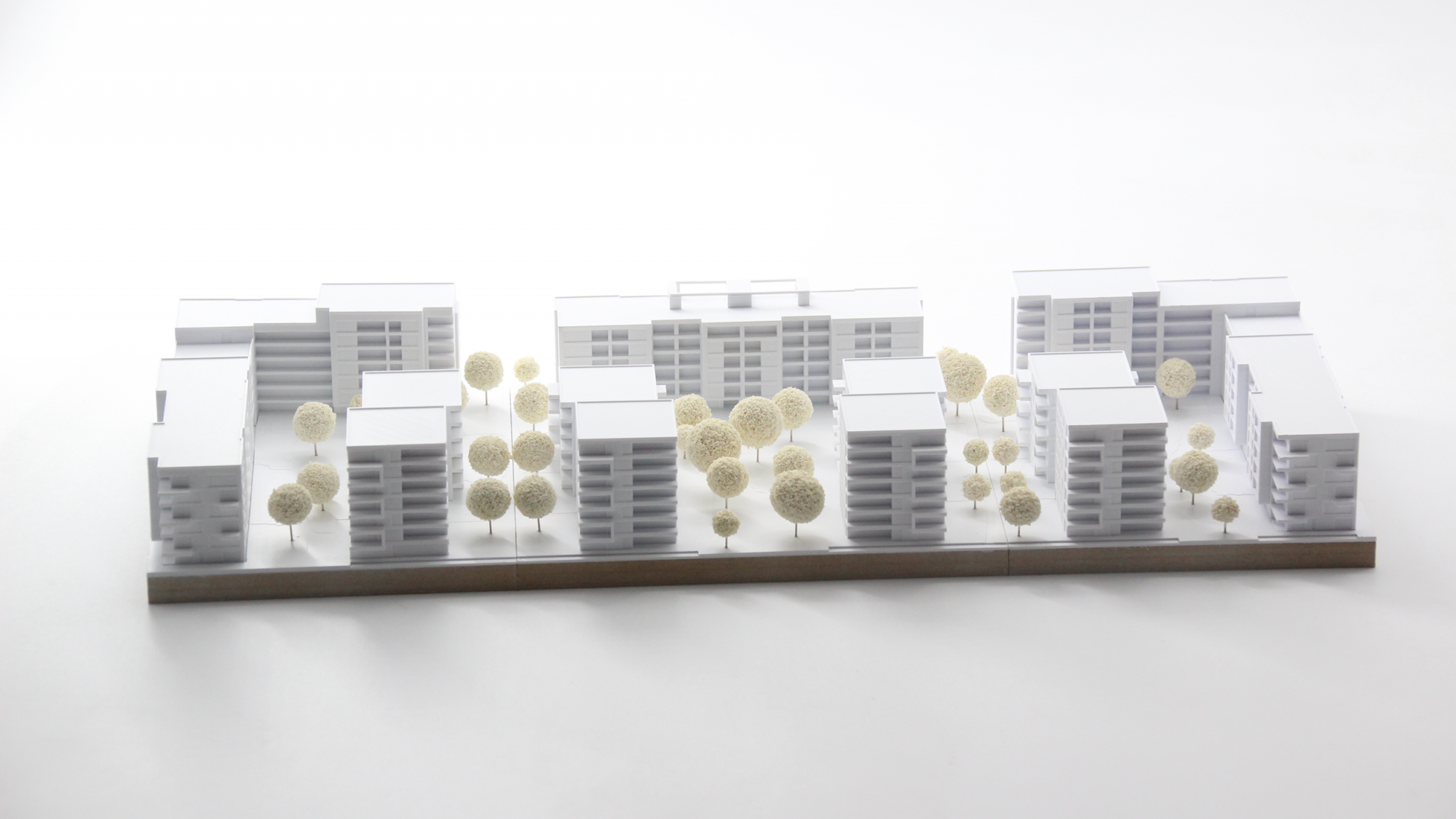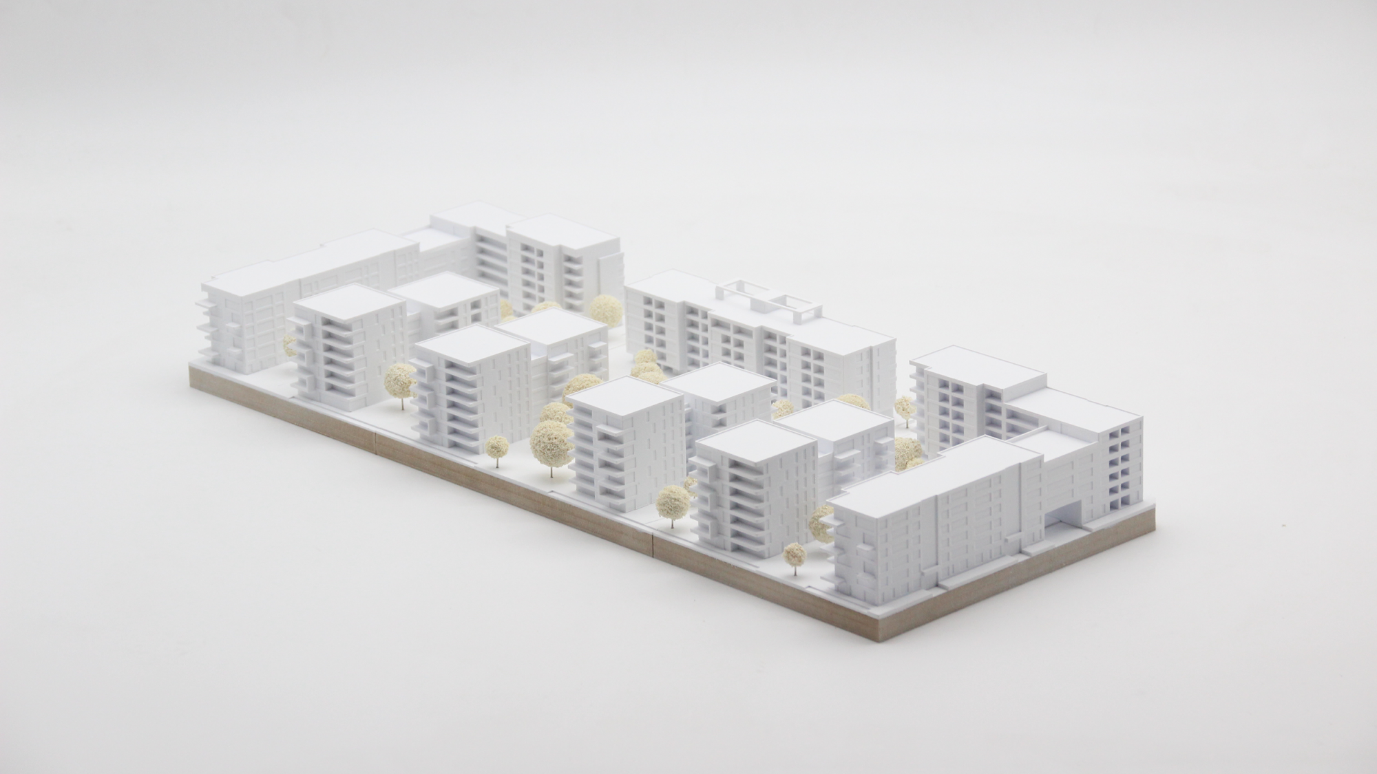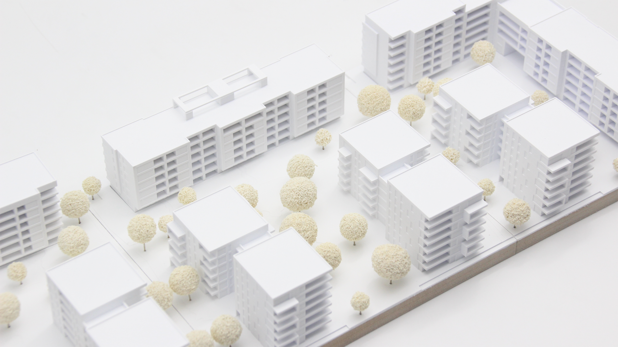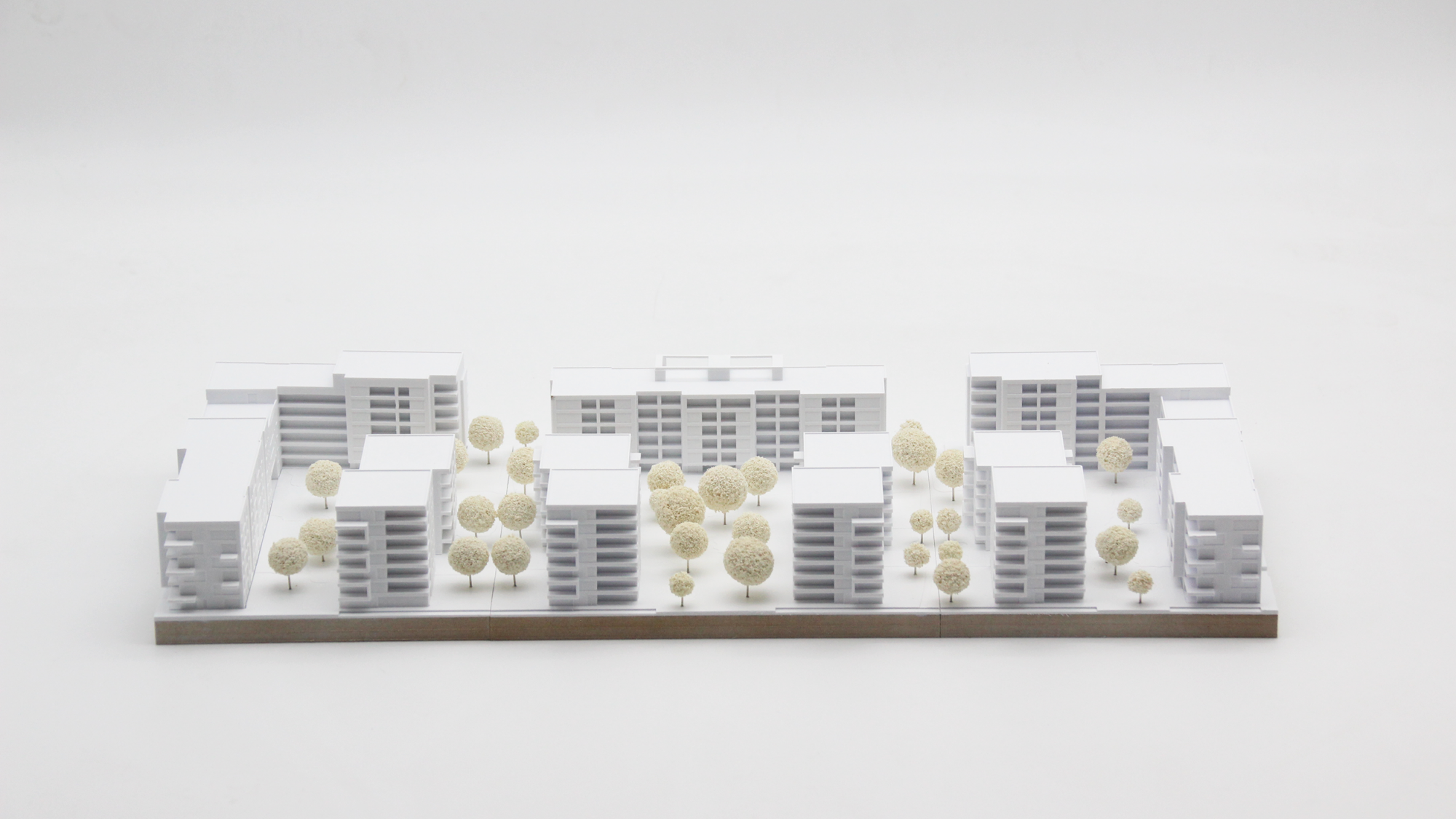 Das Architekturmodell, das für einen Wettbewerb in Frankfurt erstellt wurde, umfasst drei Einsatzplatten und zeigt eine Vielzahl von unterschiedlichen Loggien, Balkonen und Rücksprüngen, die charakteristisch für die Gebäude sind. Der hohe Detaillierungsgrad des Modells betont die scharfen Kanten und Kubaturen der Gebäude, wodurch ihre Architektur noch deutlicher hervortritt.