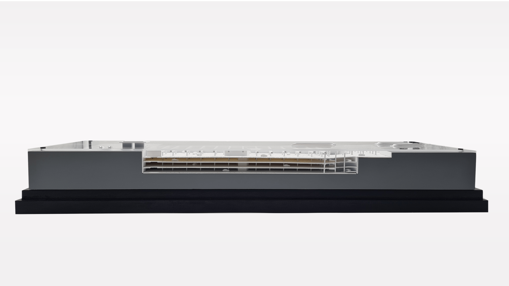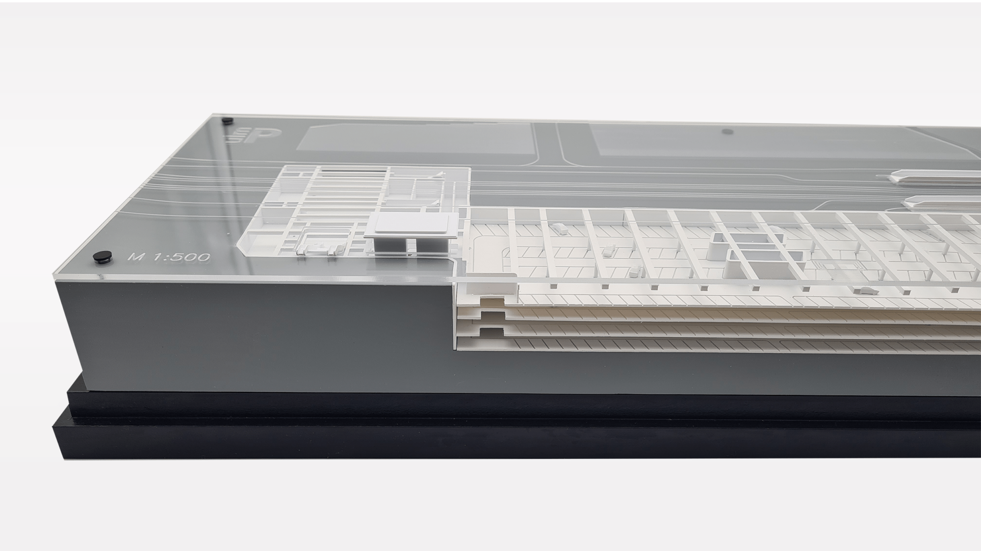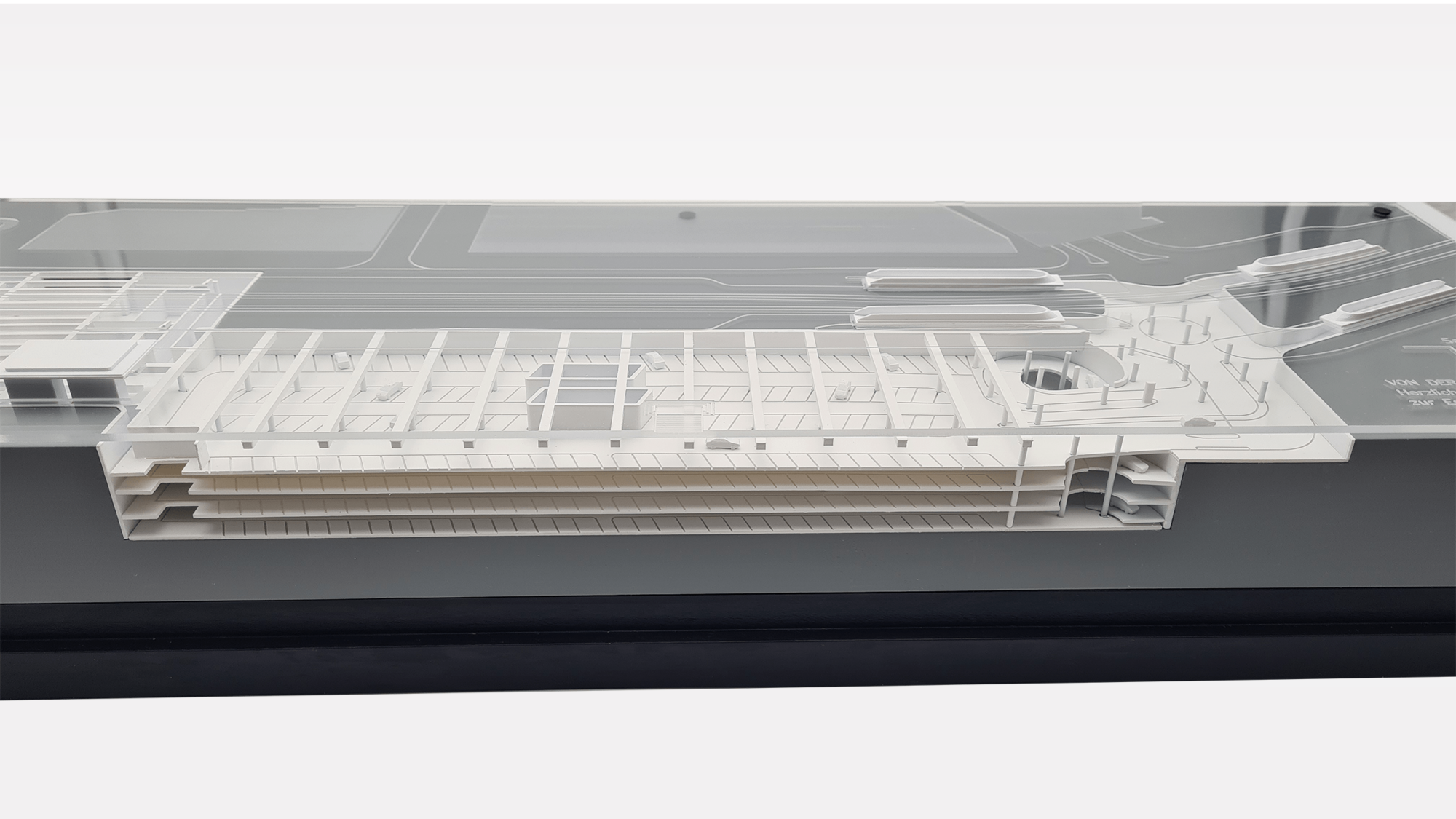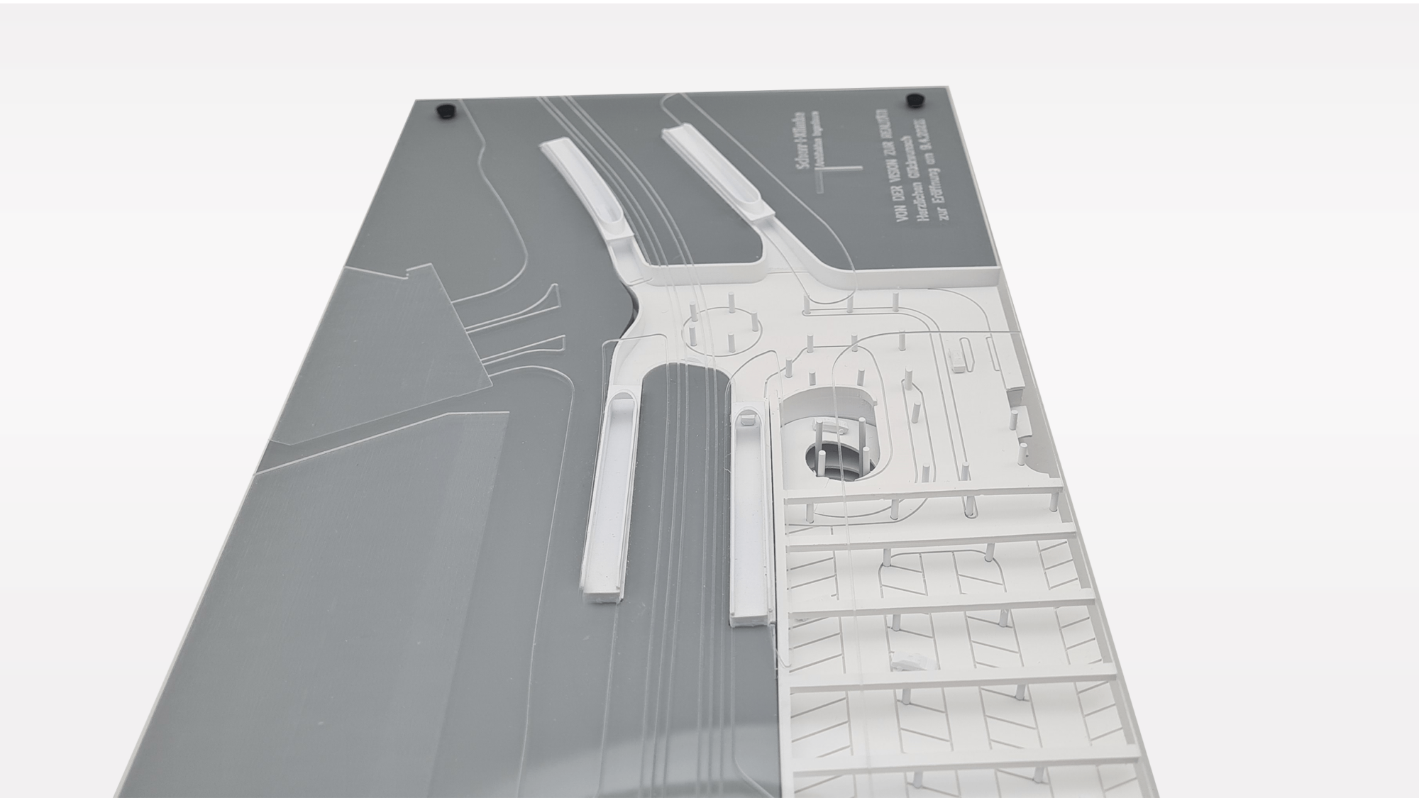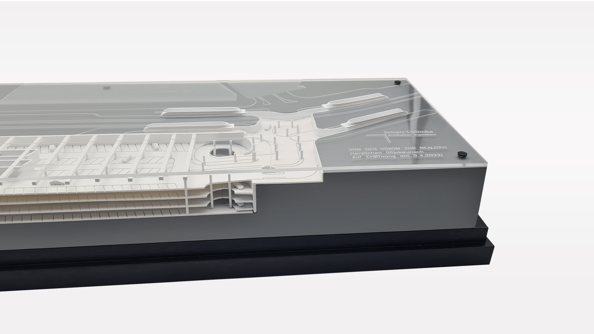 Das Architekturmodell wurde realitätsgetreu im Maßstab 1:500 nachgebildet. Sämtlich Streben, Unterzüge, Auf – und Abfahrrampen wurden maßstabsgetreu abgebildet. Durch den Einsatz von Plexiglas konnte das Architekturmodell transparent und zugänglich umgesetzt werden.