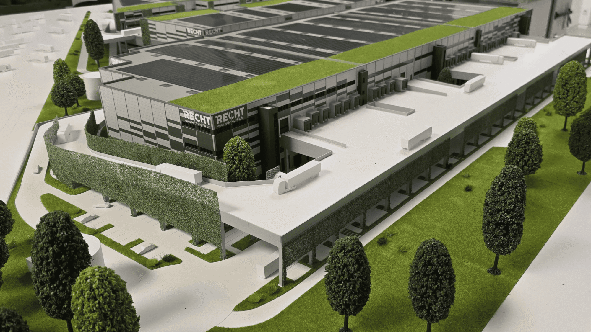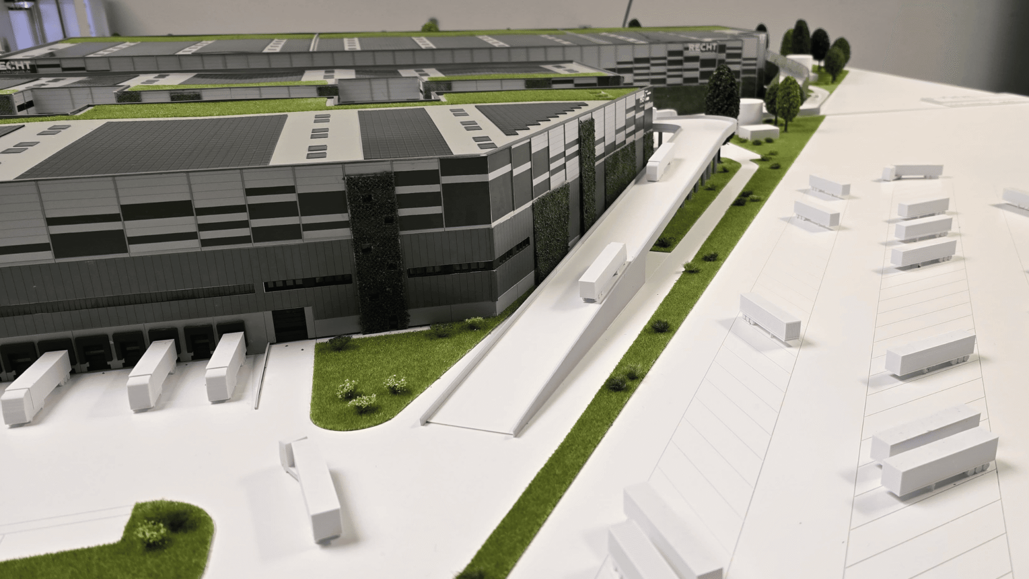 Zusätzlich zeigt das Modell die Erschließung der Anlage mit Auffahrrampen, Straßenführung und Verkehrsflächen, wodurch die Funktionsweise des Logistikstandorts nachvollziehbar wird.
