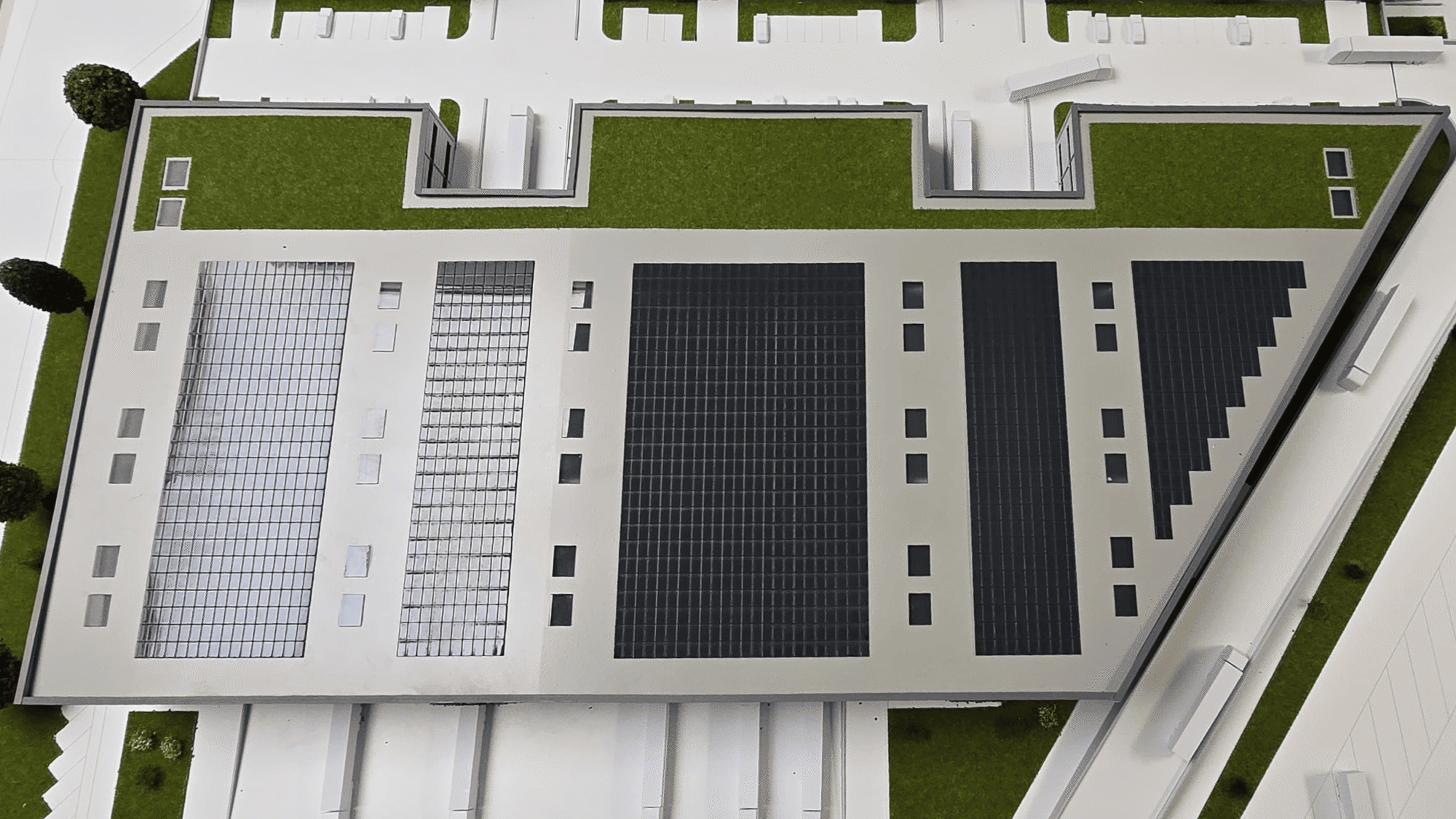 Auch die technische Infrastruktur des Gebäudes wurde berücksichtigt. Auf den Dachflächen der Logistikhalle sind die geplanten Photovoltaikanlagen dargestellt, die einen wichtigen Bestandteil des Energiekonzepts des Gebäudes bilden.