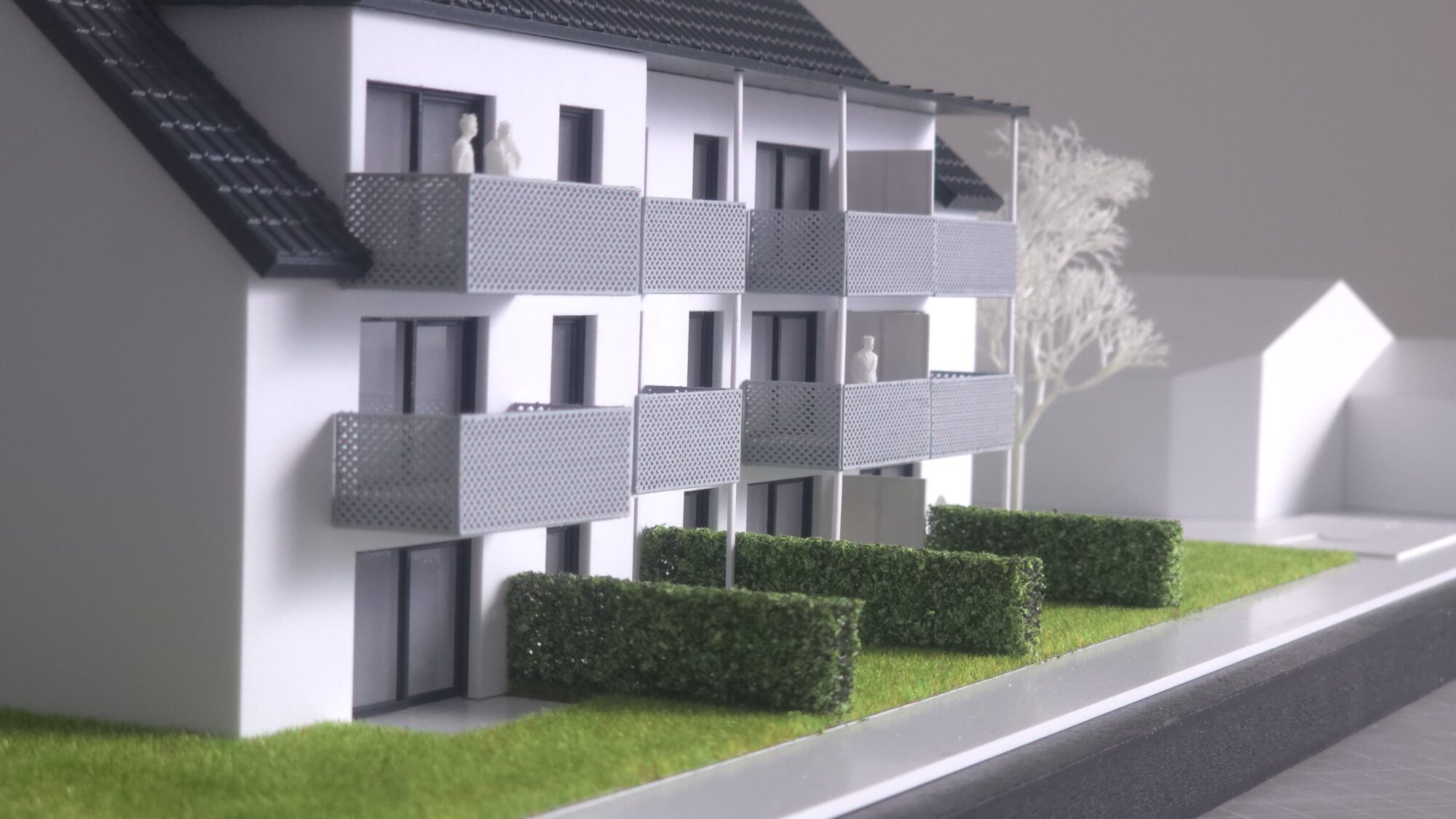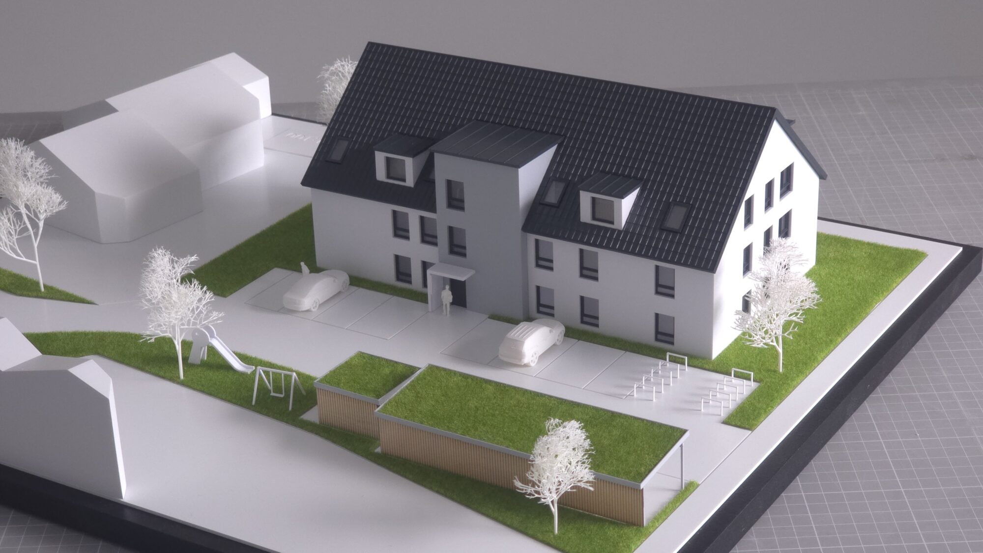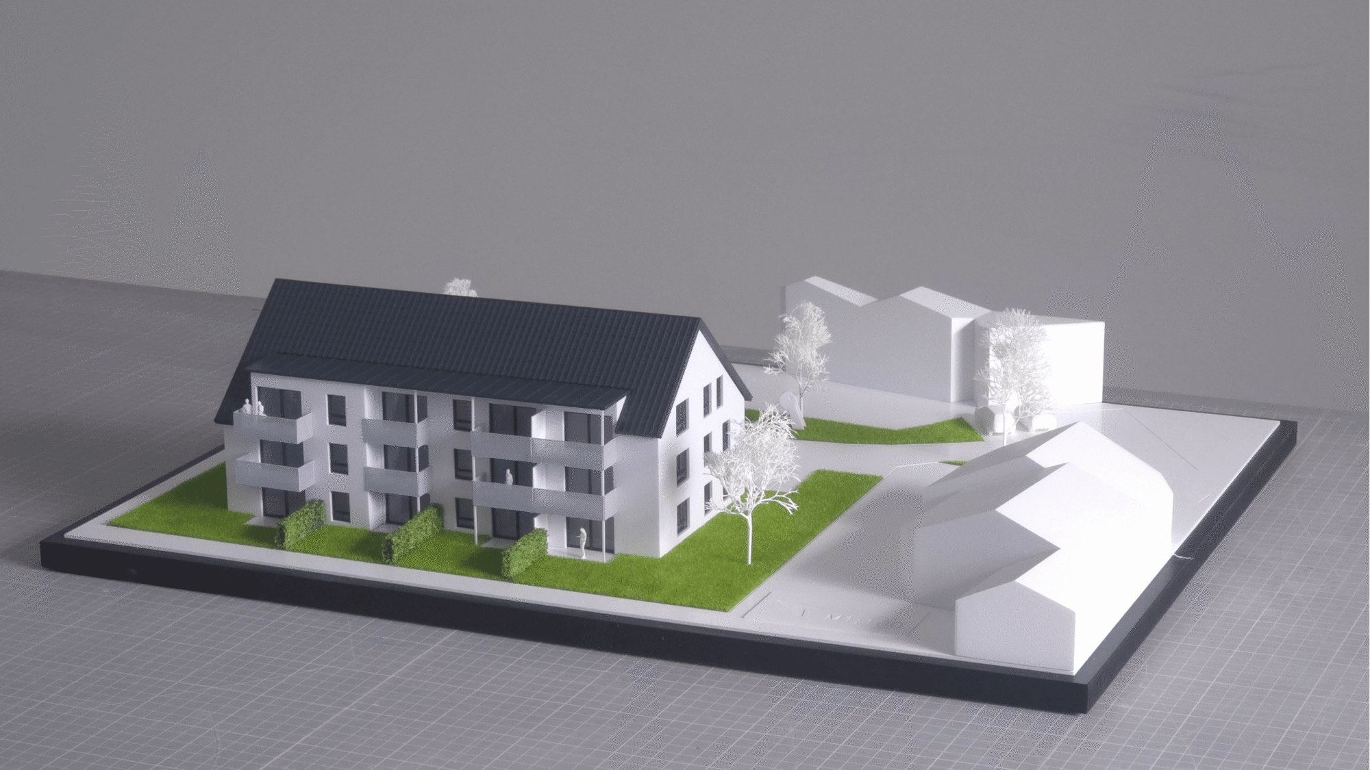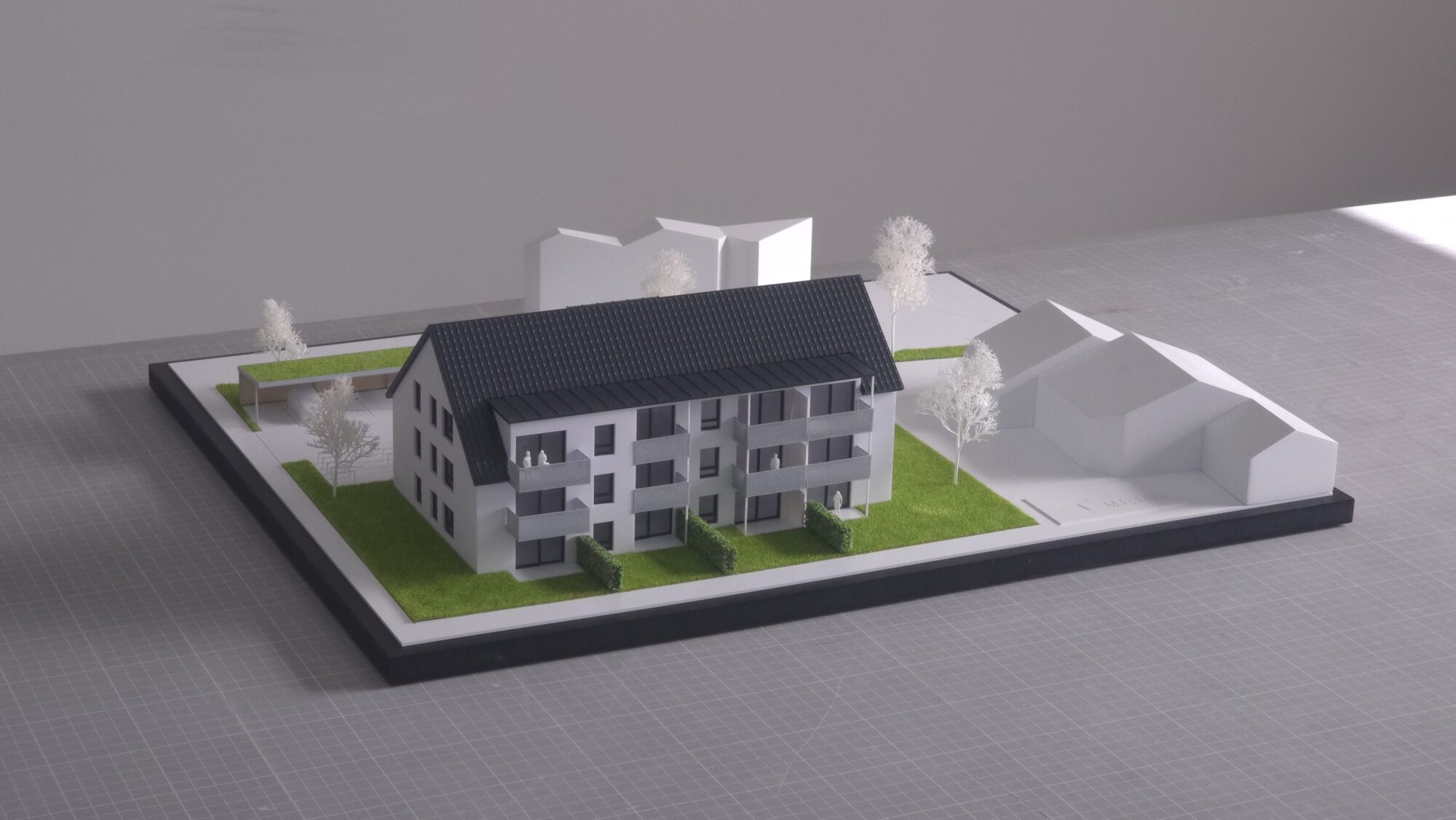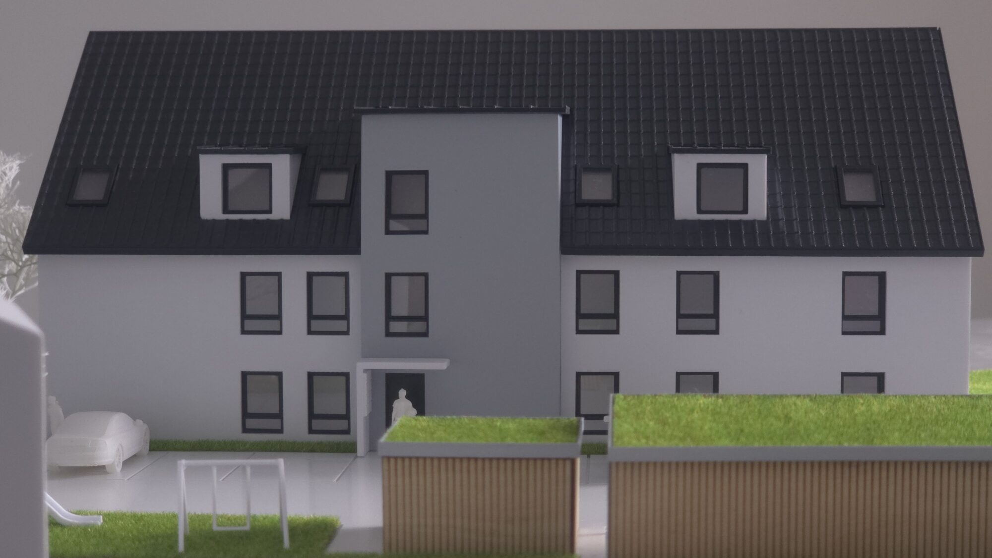 Entstanden ist ein Präsentationsmodell im Maßstab 1:100, das den Entwurf klar in den Mittelpunkt stellt: Ein Mehrfamilienhaus mit nachvollziehbarer Freiraumgestaltung, Stellplatz- und Fahrradlogik sowie reduzierter Umfeldkubatur. Damit eignet sich das Modell als verlässliche Grundlage für Vermarktung, Abstimmung und Entscheidung – vom Tischgespräch bis zur Auslage.