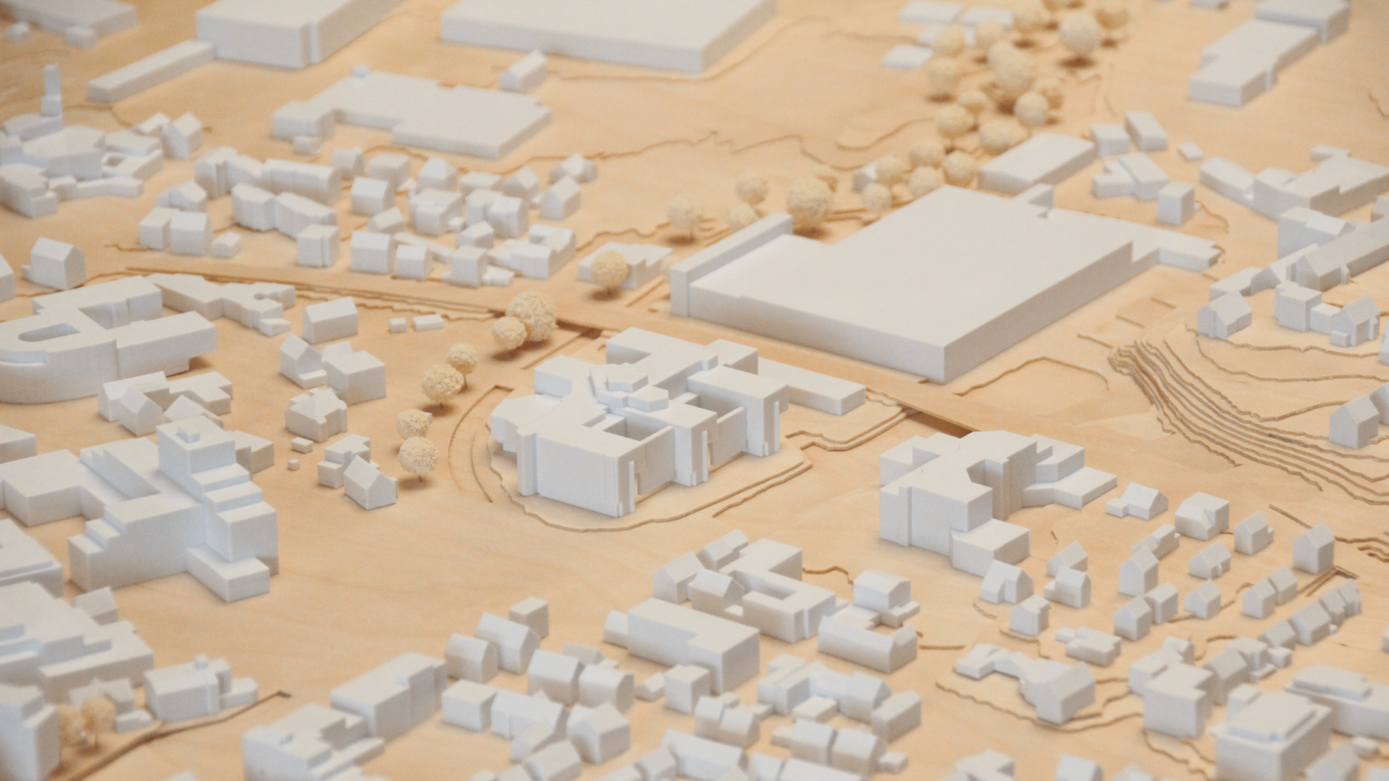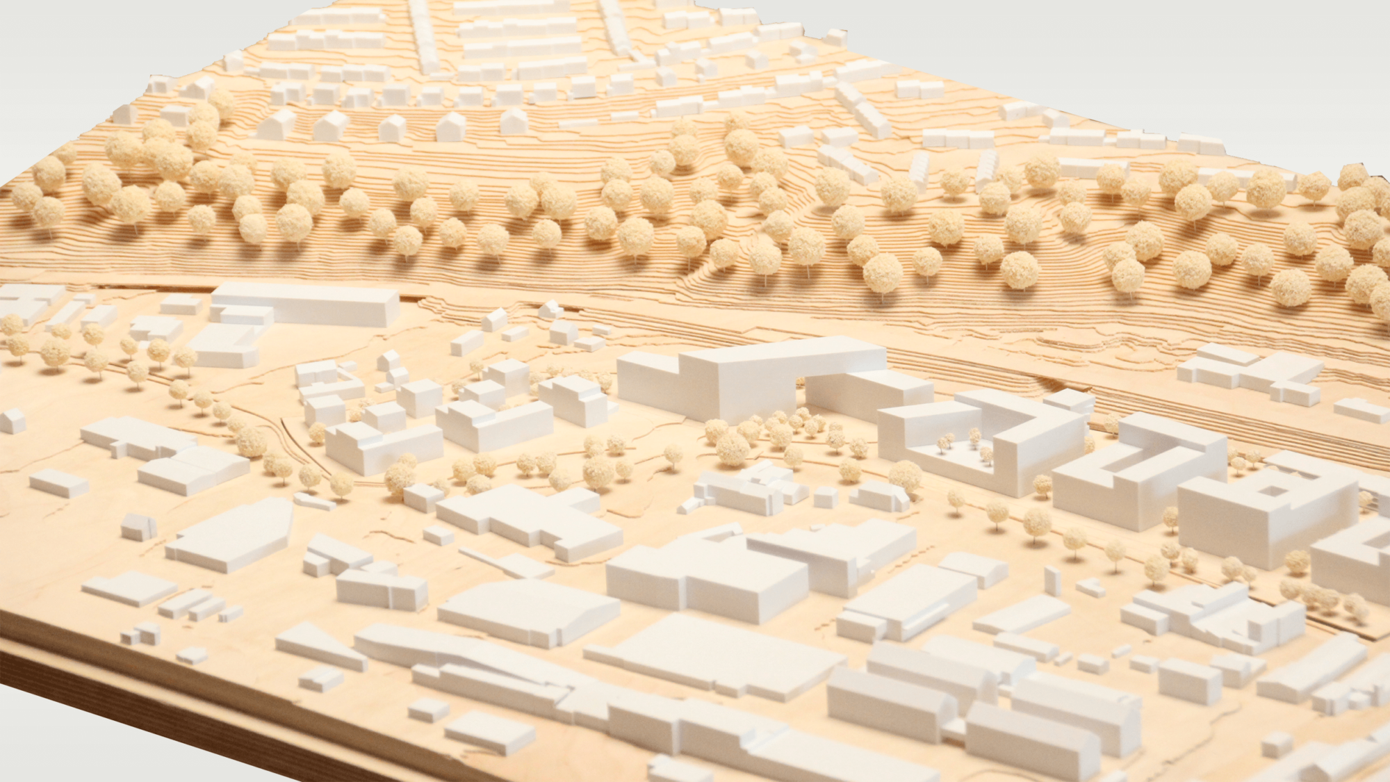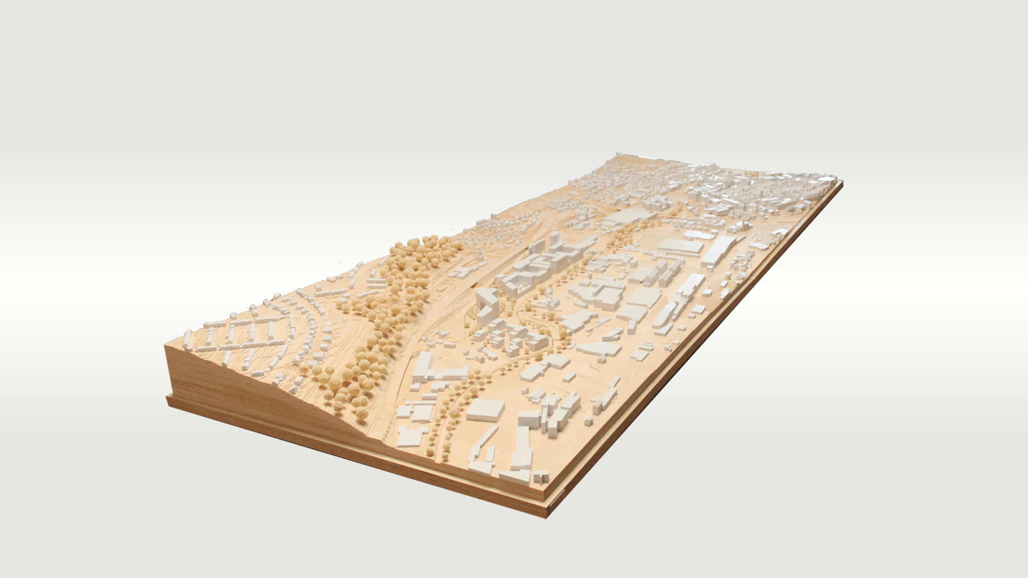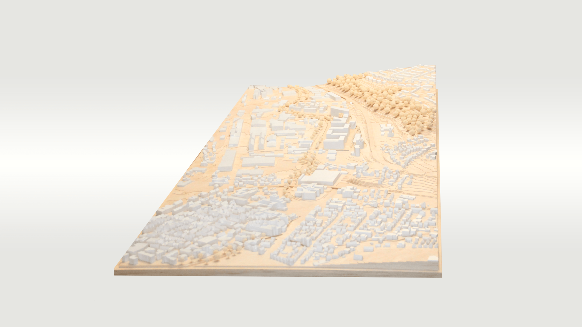 Die Topgrafie wurde hierbei aus 1mm Schichten aus Holz dargestellt, während sich die Bebauung aus weißem PLA davon abhebt.