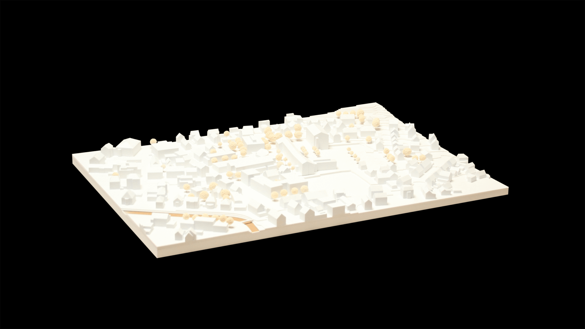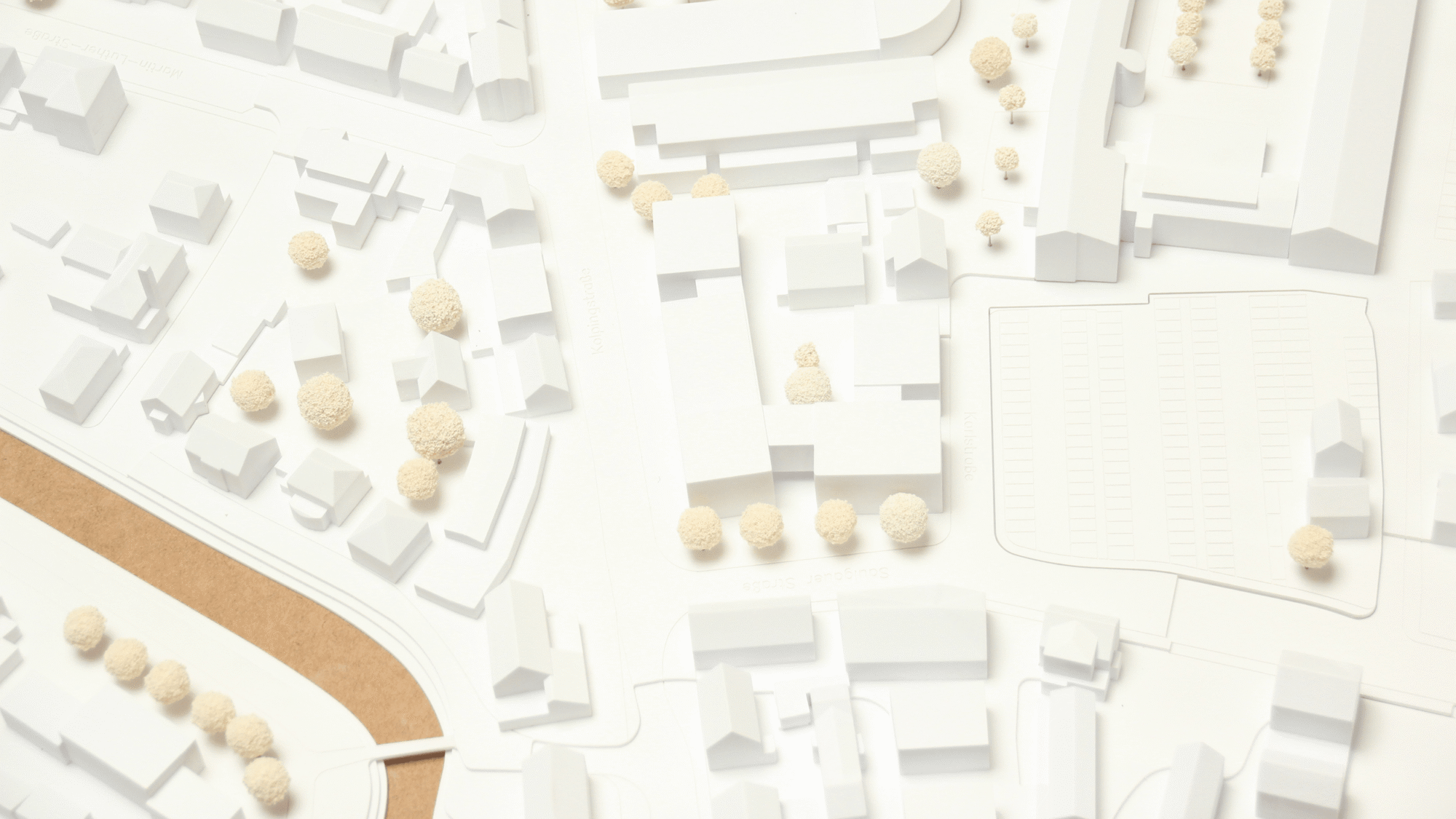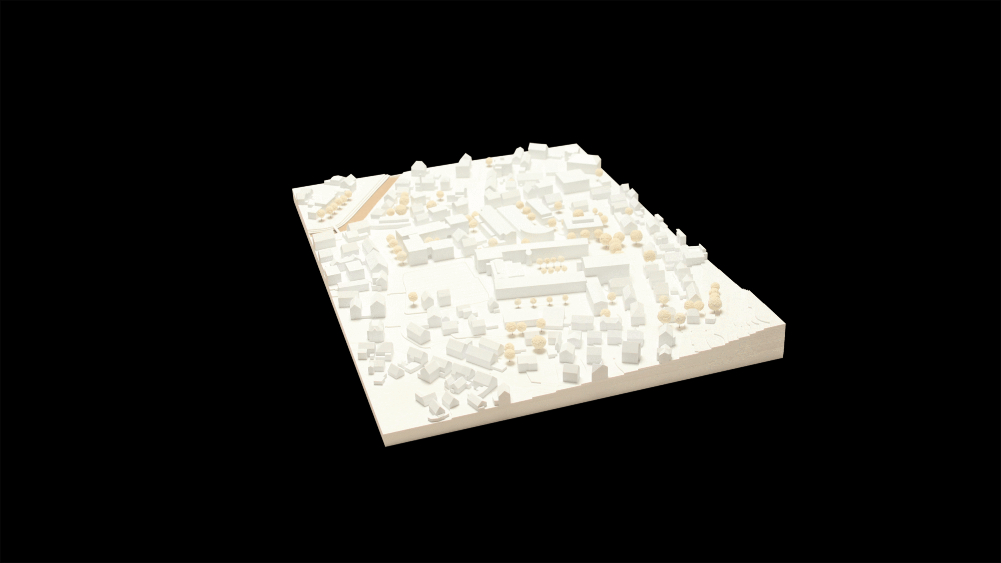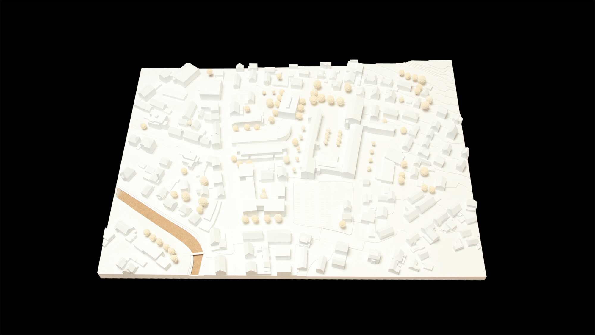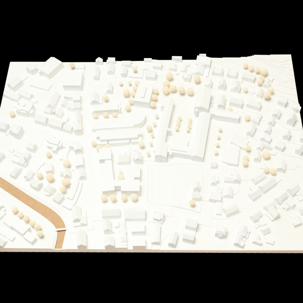 Das Modell dient dazu, die räumliche Einbindung des Standorts auf einen Blick lesbar zu machen. Gerade bei öffentlichen Bildungsbauten entscheidet der Kontext darüber, wie Erschließung, Freiraum, Maßstab und bauliche Wirkung tatsächlich verstanden werden.