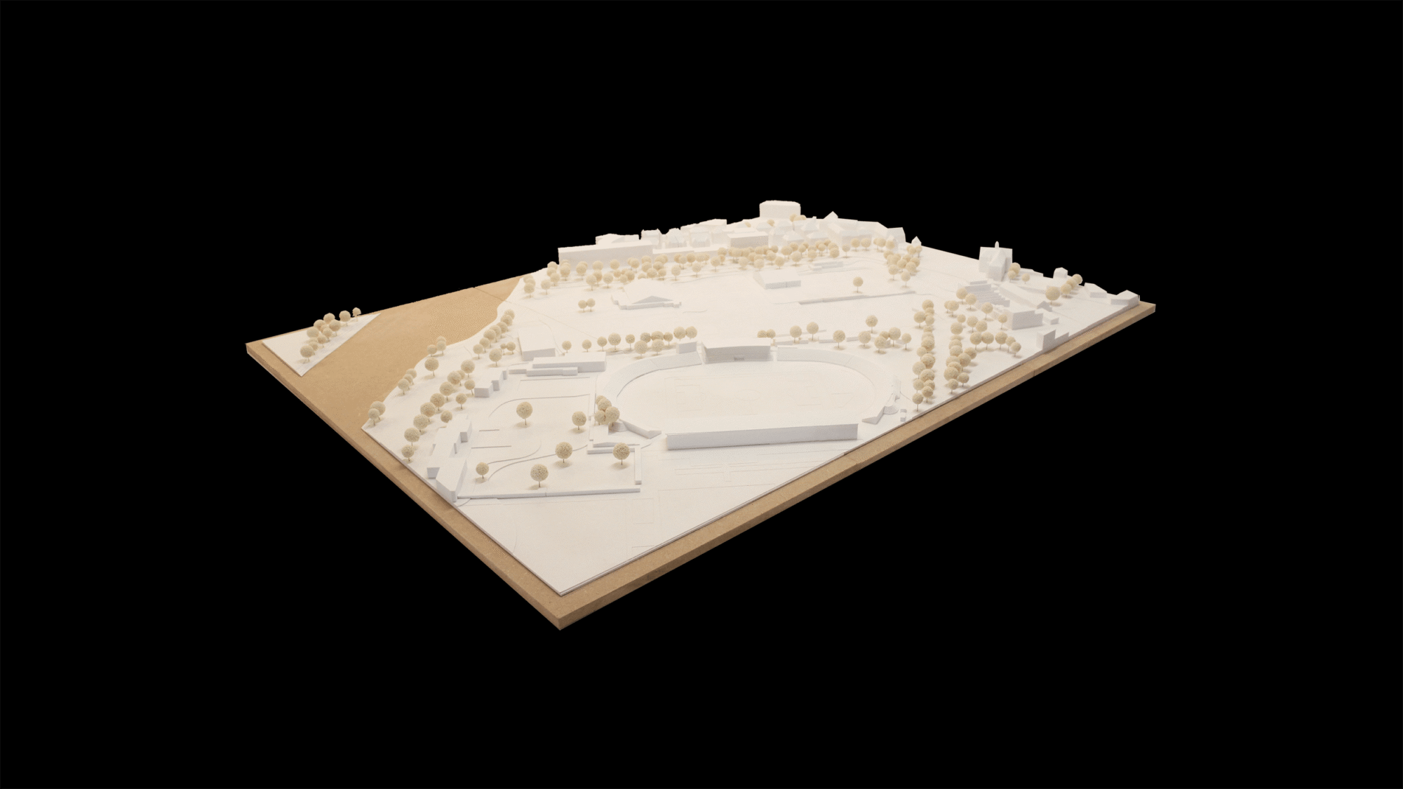 Bei Sportstätten- und Stadionprojekten ist das Umfeld entscheidend: Erschließung, Freiflächen und Nachbarschaft bestimmen, ob ein Entwurf städtebaulich funktioniert. Deshalb wurde das Umfeld als ruhige, neutrale Masse umgesetzt – ohne Material- oder Farbigkeit, die einen Entwurf „interpretieren“ würde. Der eigentliche Entwurfsbereich bleibt als klar definierte Zone für die Wettbewerbsbeiträge nutzbar.