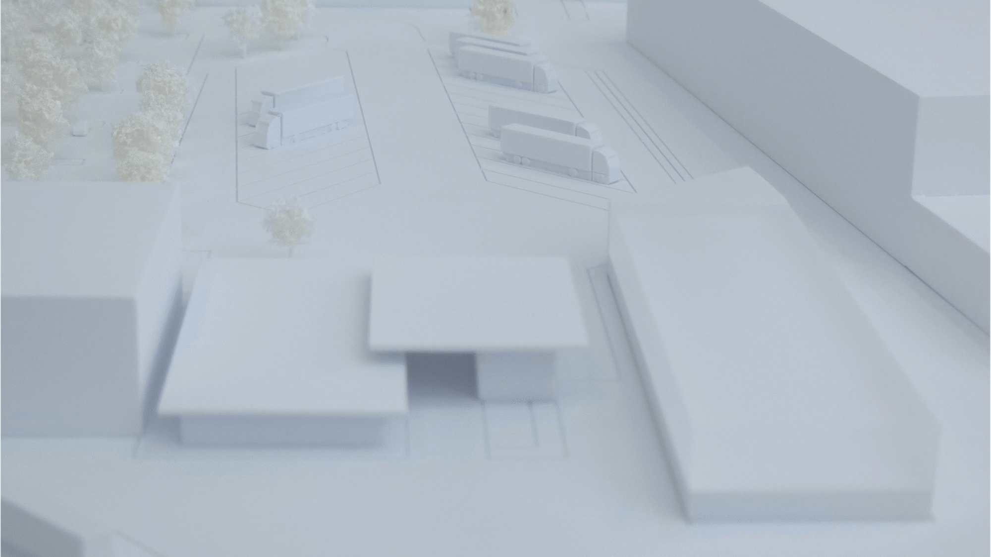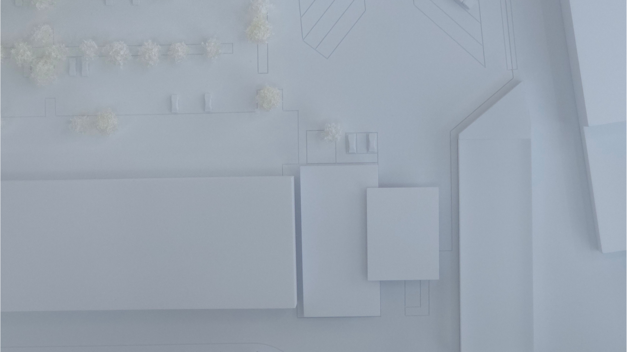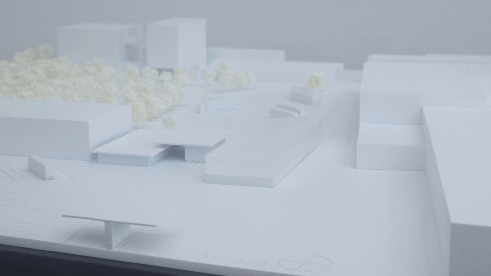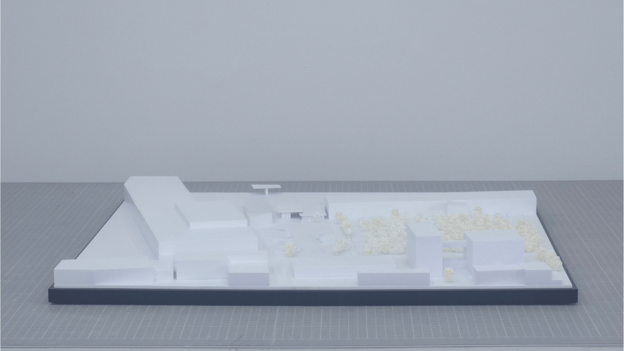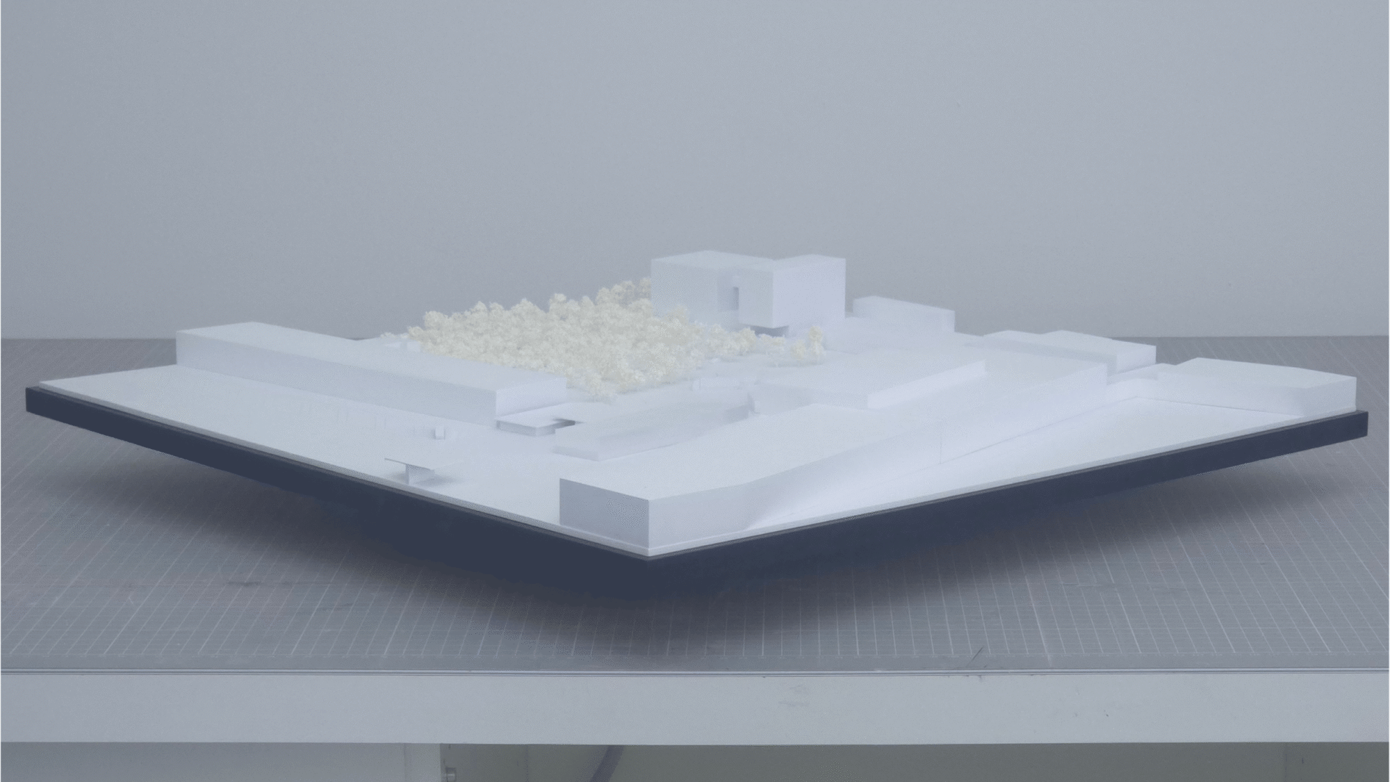 Das Modell wurde bewusst monochrom umgesetzt: Baukörper, Gelände und Umgebung erscheinen in „weiß-in-weiß“ und lassen die Massengliederung klar hervortreten. Ein Baumbestand/Vegetationsfeld markiert den Landschaftsraum und schafft Orientierung, ohne den Blick auf die Werkserweiterung zu überlagern.